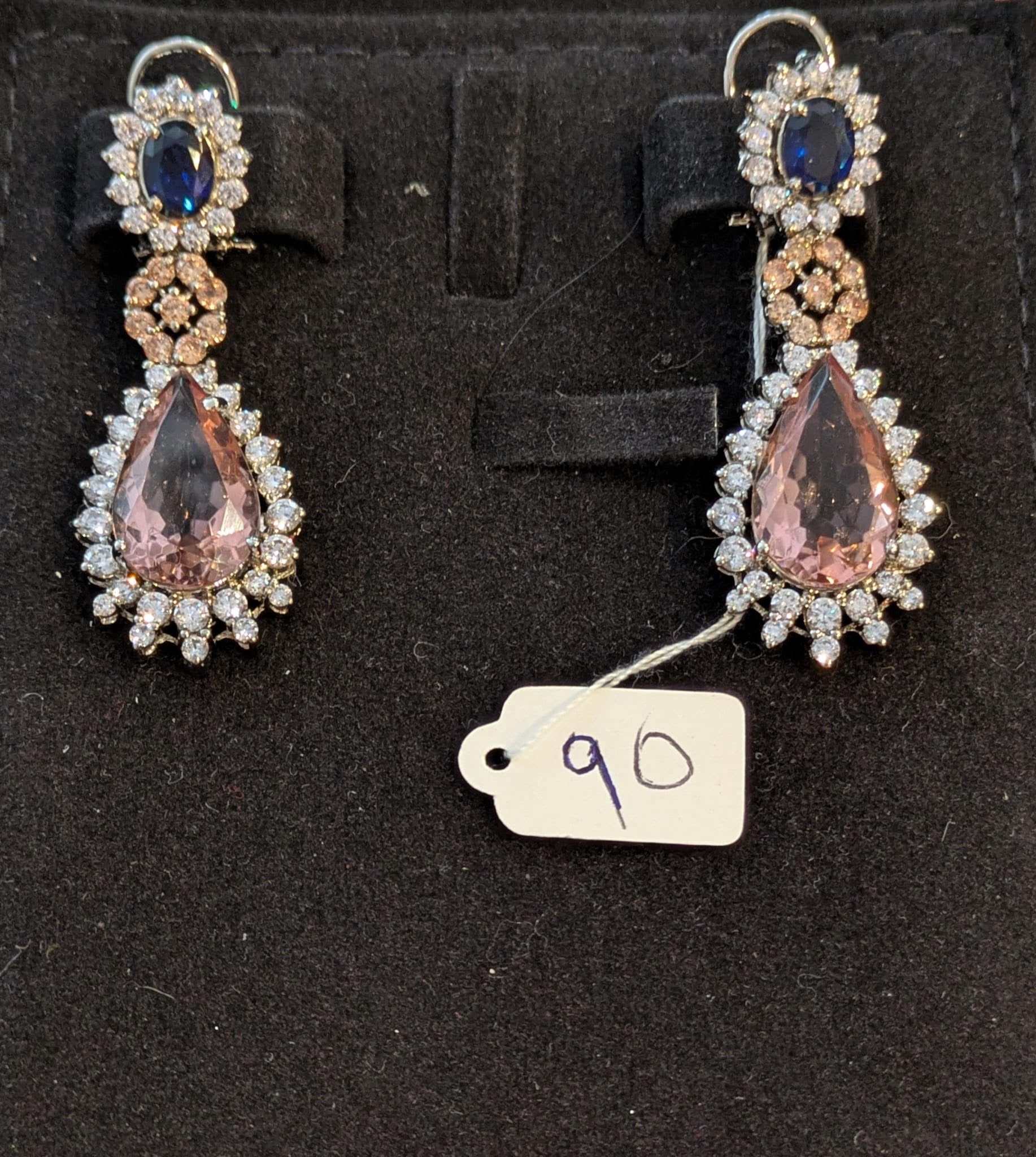 ✨ Crafted with real silver, these elegant 3 stone drop earrings are perfect for any occasion. The unique design of sapphire, silver, and light pink will prove to be an eye-catching design wherever you go.